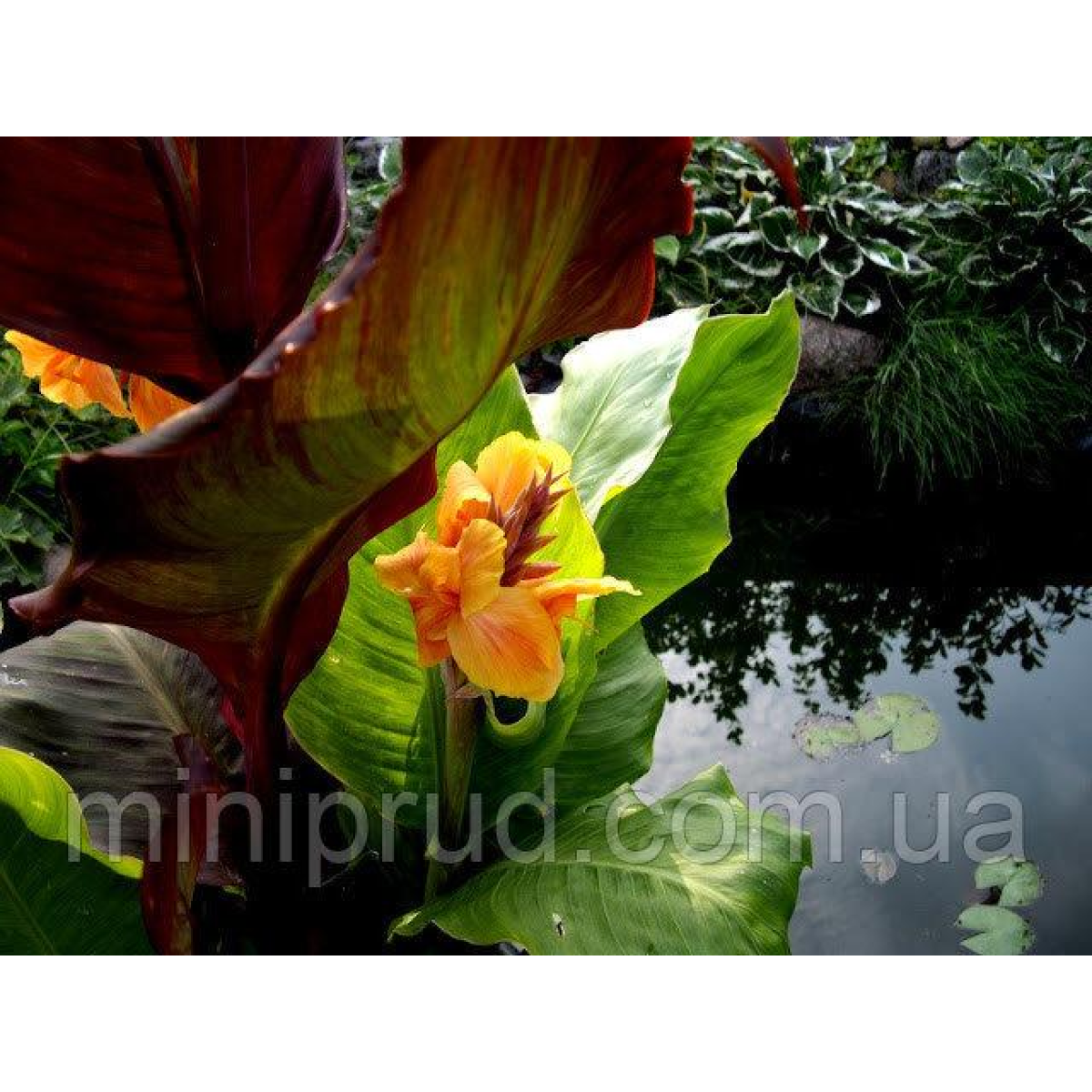 КАННА ВОДНА з великою тигровою квіткою - один з найкрасивіших сортів водних канн. Цвіте з червня і до заморозків. Квіти жовто-оранжеві, великі, в цяточку, лист широкий, великий, світло-зелений. Невимоглива до розміщення - може рости як на сонці, так і в тіні (у тіні менше цвіте). Виростає до 0,7-1,0 м у висоту. Через велику парусність листя горщик з канной вимагає закріплення на дні водойми, щоб не перекидатися при сильному вітрі (можна обкласти горщик цеглою, придавити камінням тощо). Не сильно розростається - потребує пересадки у велику ємність на 3-4 рік.