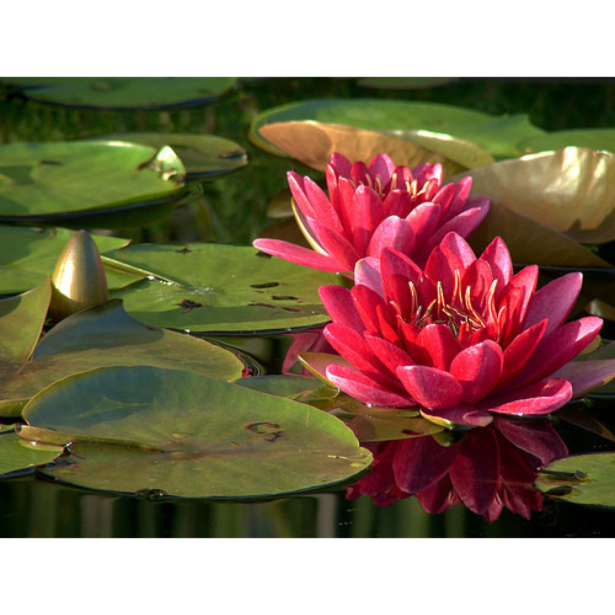 НІМФЕЯ James Brydon - середньорослий, компактний сорт з червоними квітами. Квітка насиченого яскраво-гранатового кольору, піоновідний (багатопелюсткова) . Листки середні, змінюють свій колір від яскраво-зелених до темно-зелених. Зимує в непромерзаючому водоймі. Підійде для маленьких ставків або для середніх з невеликою глибиною посадки.