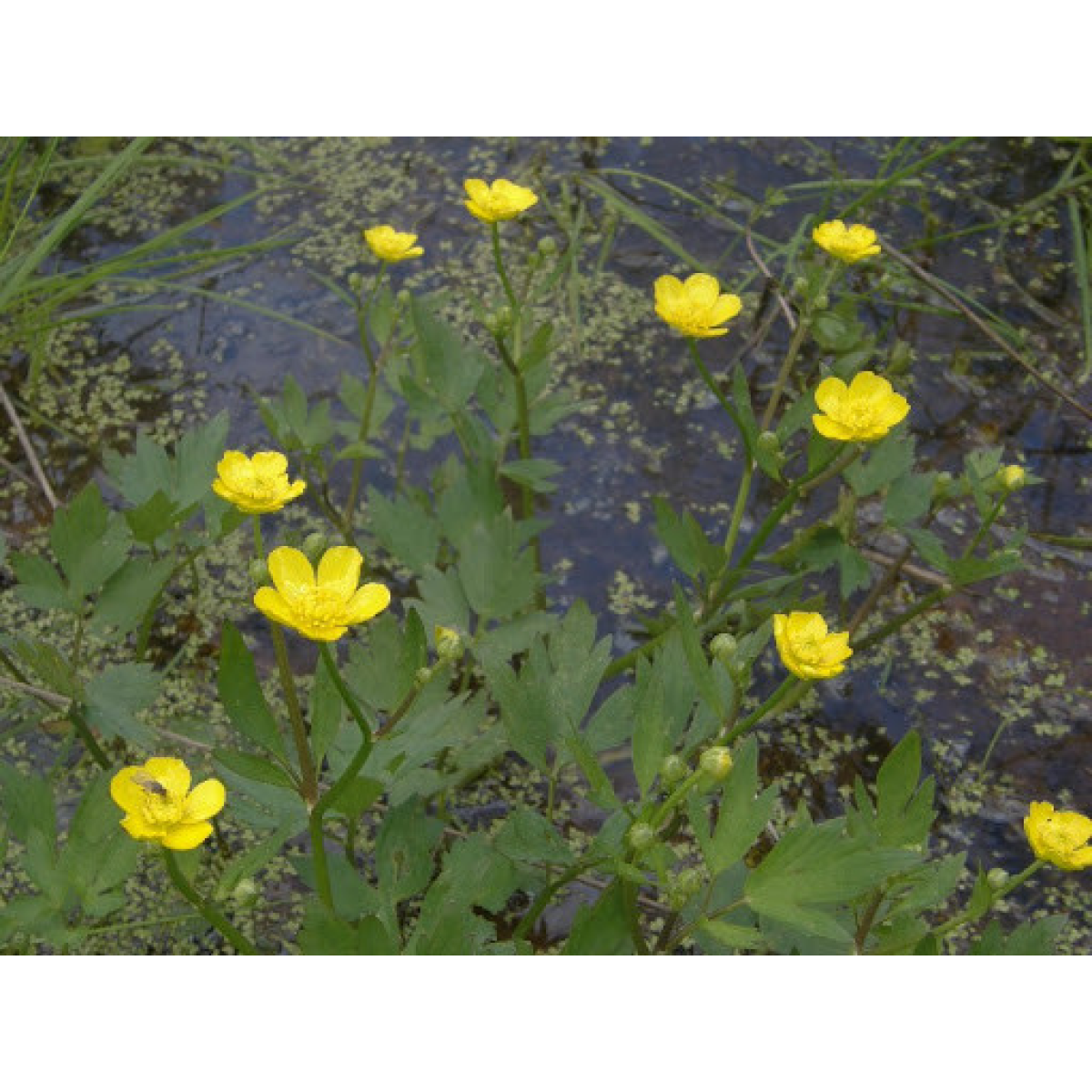 ЖОВТЕЦЬ ПОВЗУЧИЙ (Ranunculus repens) - рослина багаторічна і відноситься до трав'янистих. Ранункулюс в перекладі з латині означає «Жаба». ЖОВТЕЦЬ ПОВЗУЧИЙ повністю виправдовує свою назву. Він поширюється, розповзаючись в сторони, утворюючи на нових пагонах пучки або "кущі". Жовтець представляє собою чагарник, зростання його коливається від 10 до 40 см. Цвіте навесні, на початку літа, повторно цвіте восени. Квітки великі, яскраві, що привертають комах, цвітіння рясне. Кущ ЖОВТЦЮ ПОВЗУЧОГО може "мігрувати" - навіть за один сезон кущ з води здатний "вийти" на берег, розростися між каменями. При посадці на березі ставка, ЖОВТЕЦЬ здатний "переселитися" у воду.