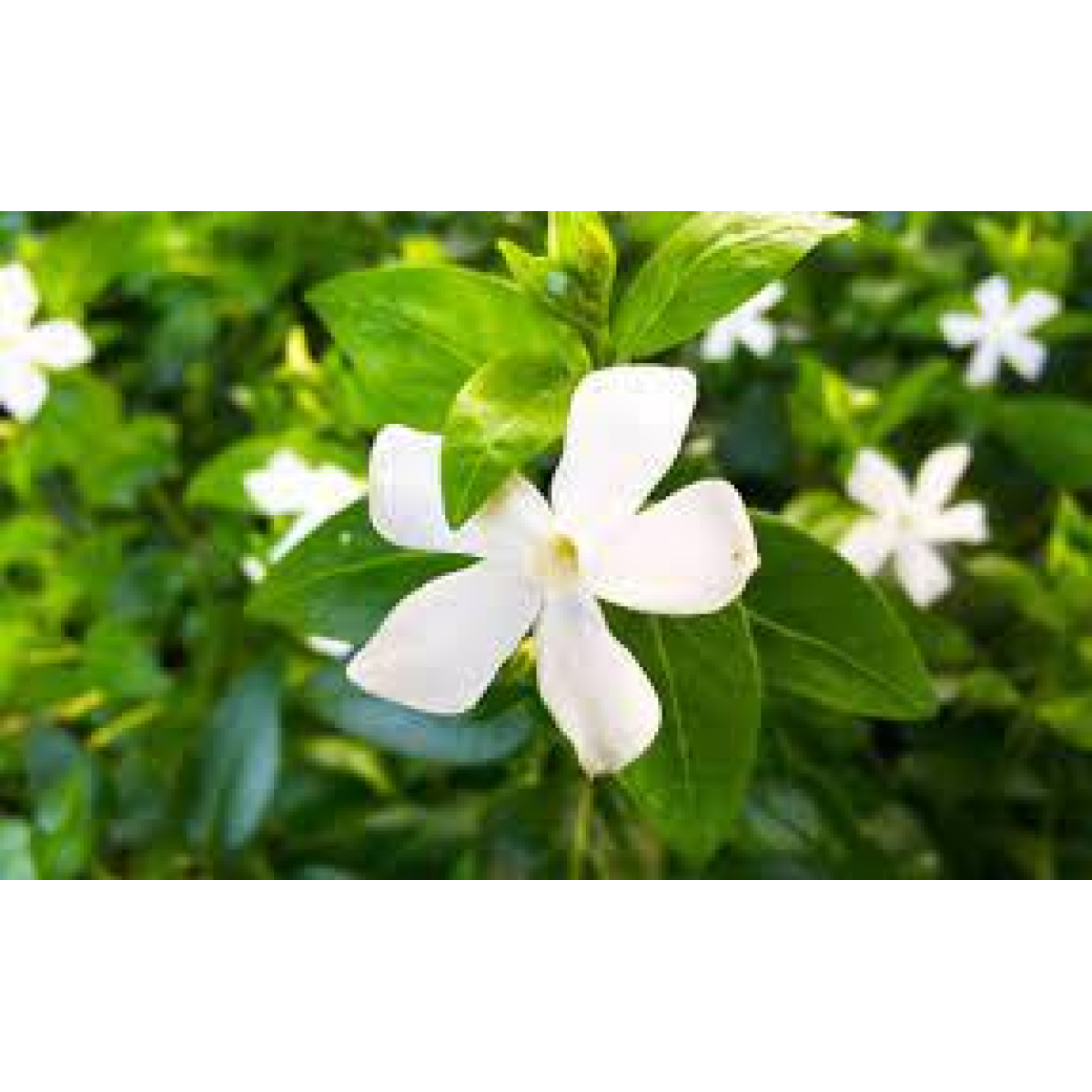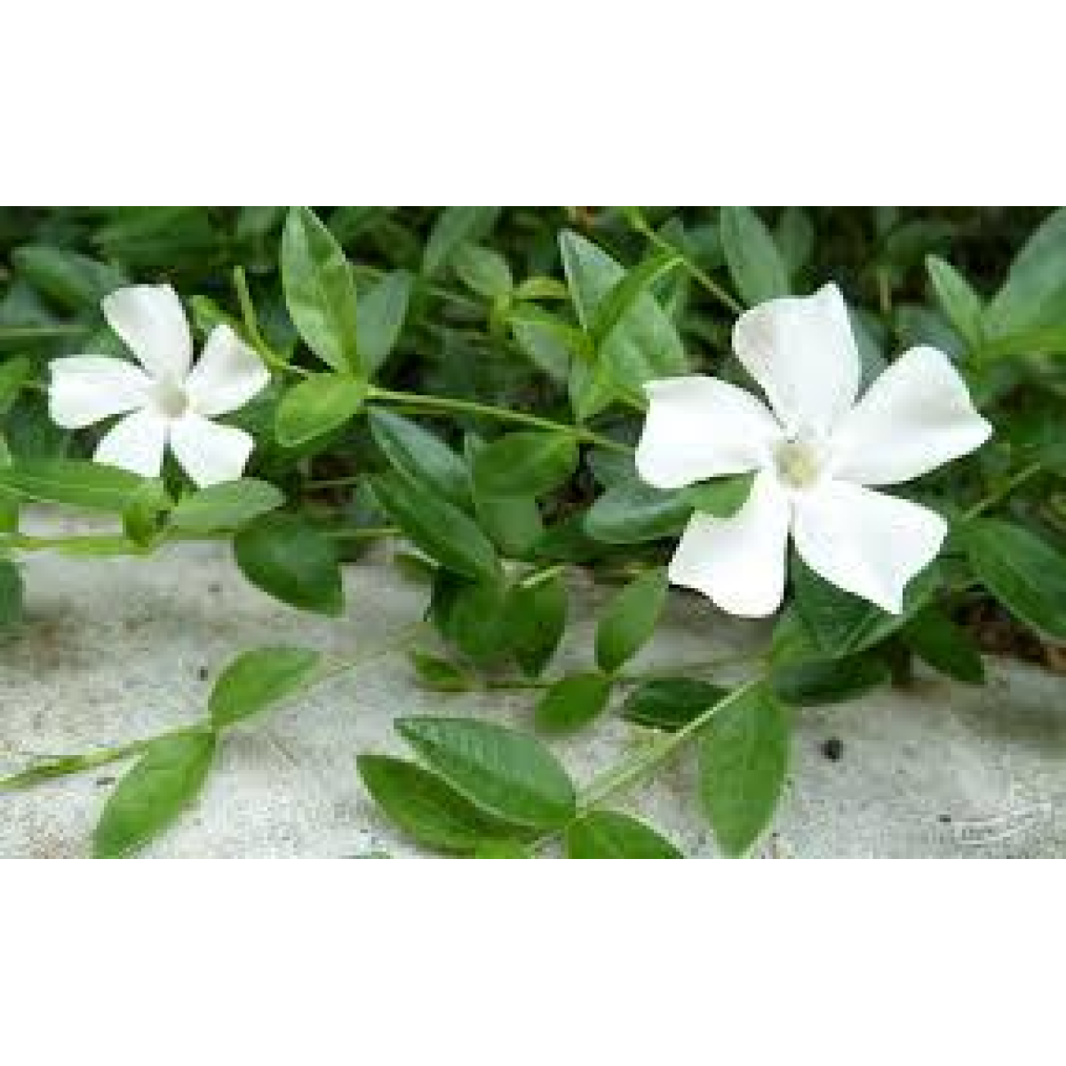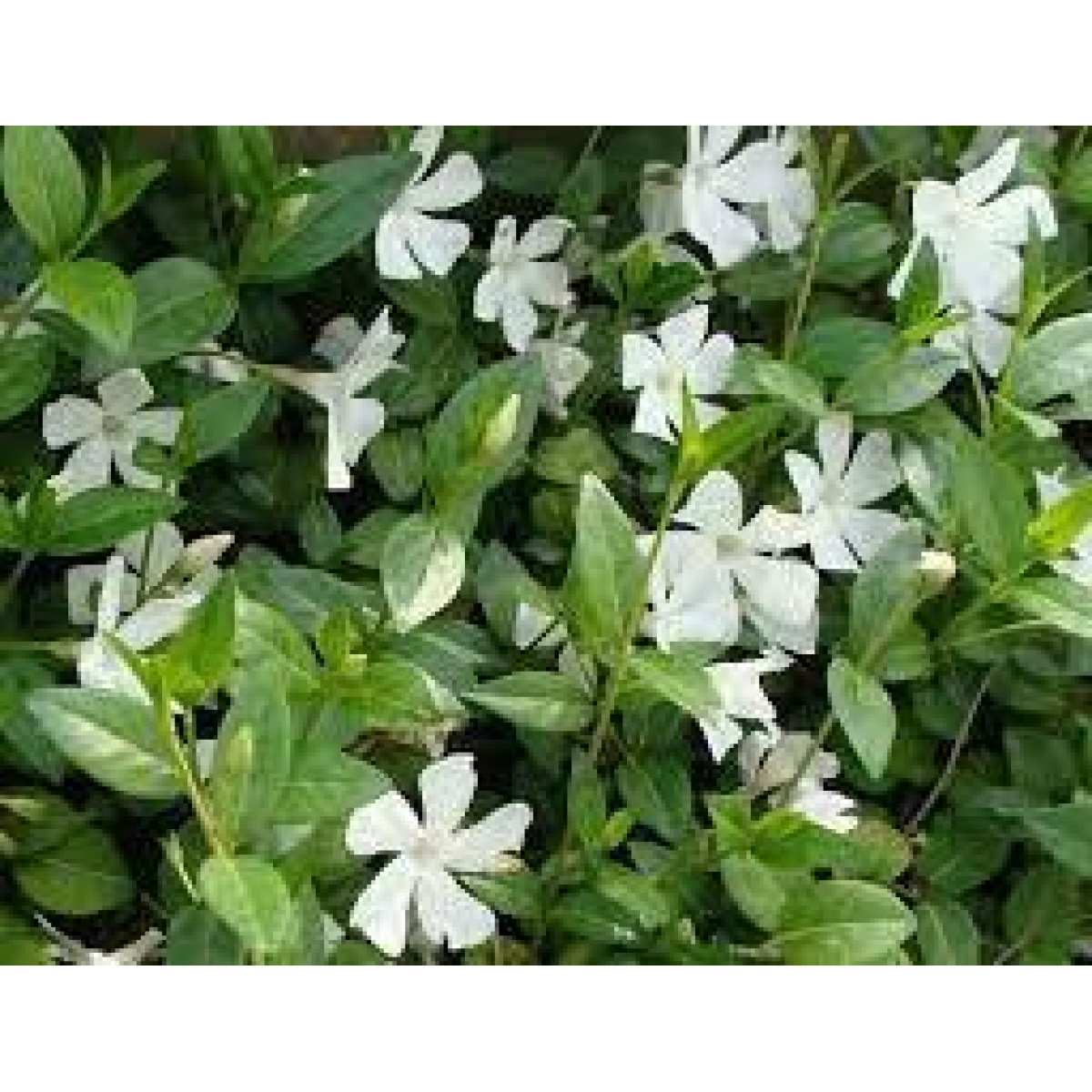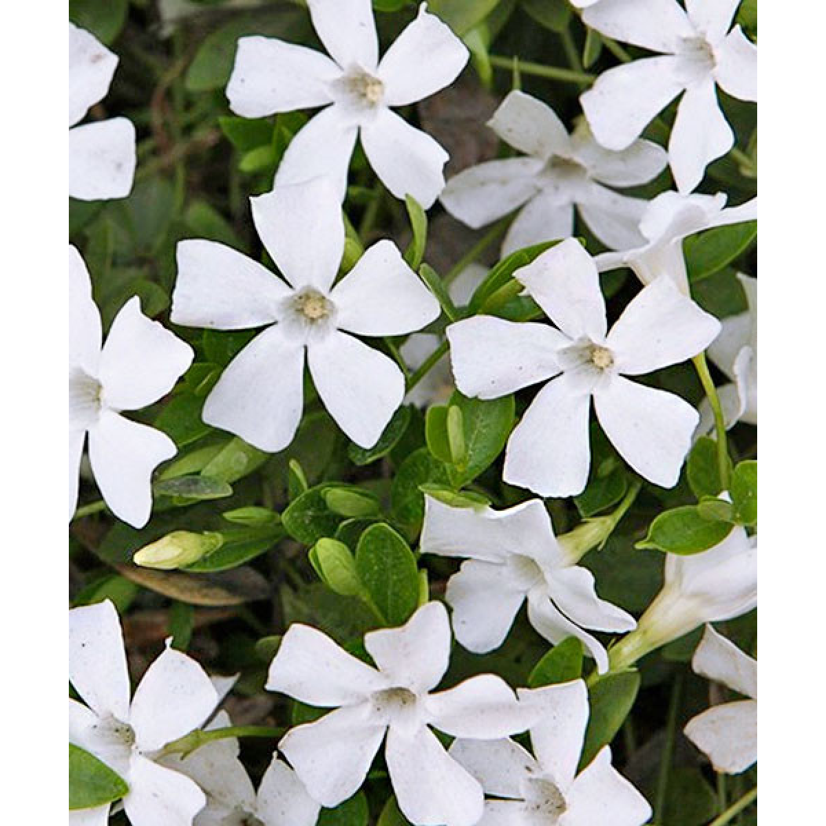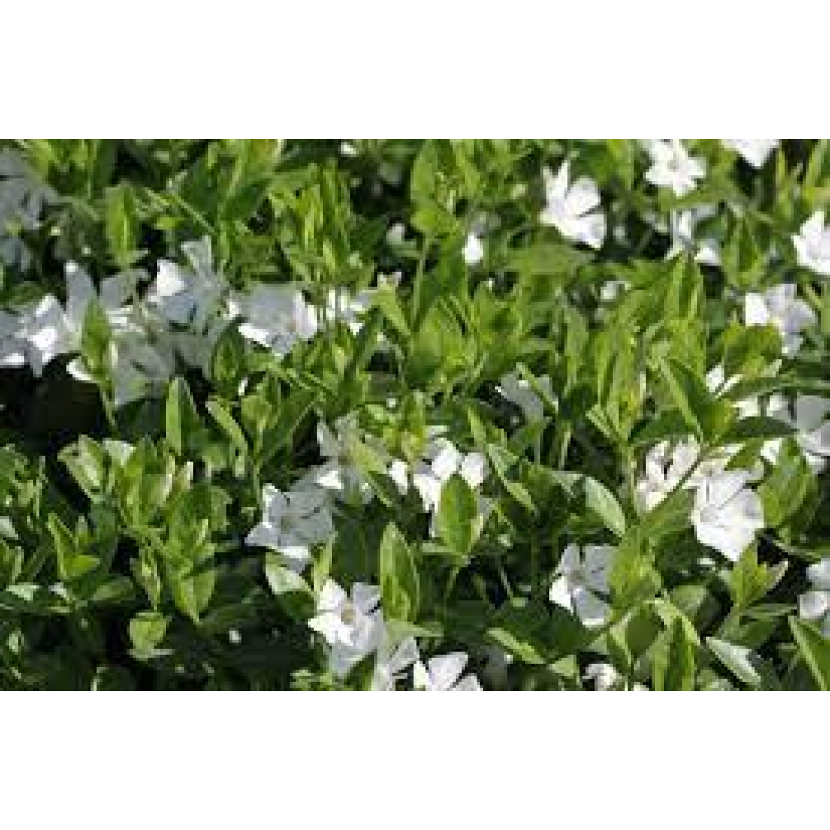 БАРВІНОК МАЛИЙ (Vinca "ALBA") - багаторічна, вічнозелена рослина, що утворює дернинку заввишки до 5 см, квітконоси до 20 см. Цвіте в травні-червень 25-30 днів, повторно цвіте восени і до заморозків. Квітки білі до 5 см, одиночні, воронкоподібні, схожі на квітки флокса. Листя - вічнозелені, блискучі, темно-зелені, шкірясті. Стійкий до витоптування, любить стрижку або викошування, швидко розростається і вкорінюється.