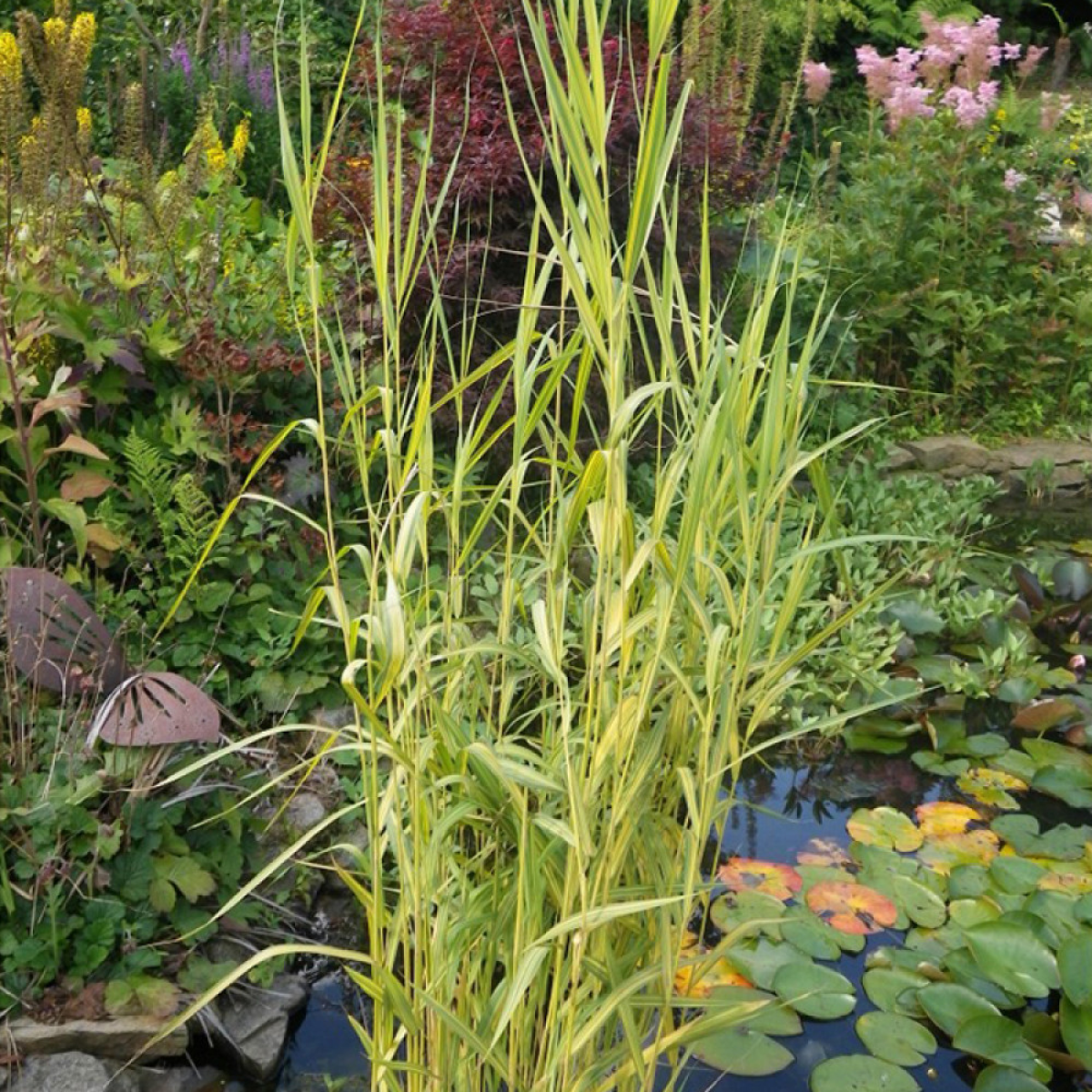 ТРОСТИНА СМУГАСТА - смугастий, варієгатний сорт тростини, дуже декоративний. Це багаторічна водна та болотяна трав'яниста рослина, зазвичай виростає до 1 м заввишки. Можна висаджувати у вологий грунт або на мілководді, мілинах і по берегах водойм на глибині 5-25 см. Невибагливий, швидко розростається. В Україні зимує у водоймах.