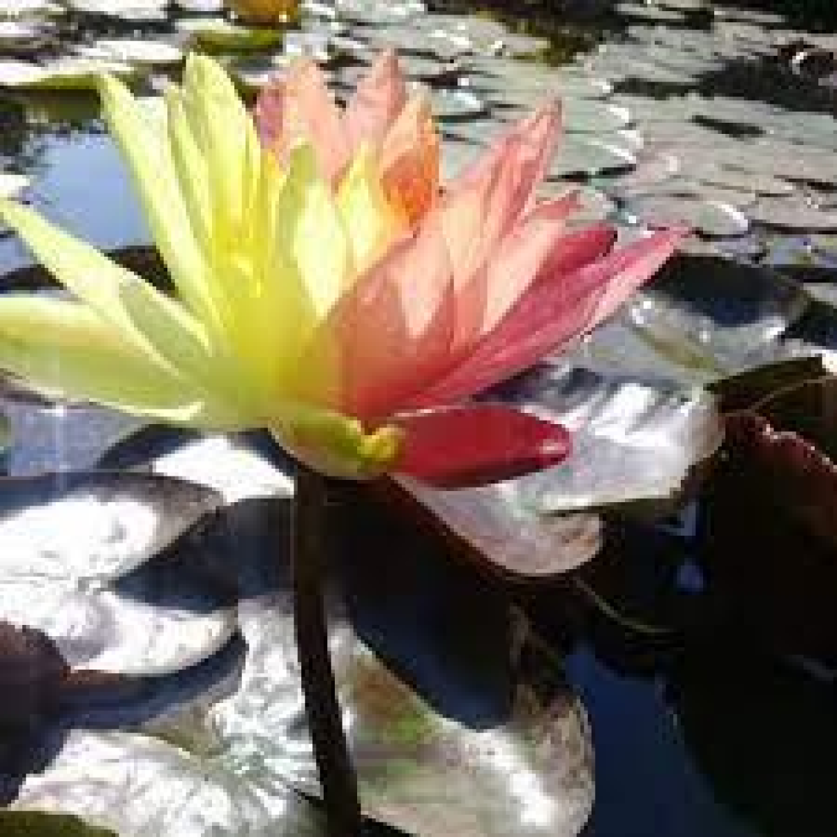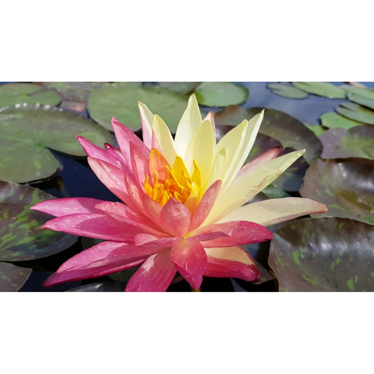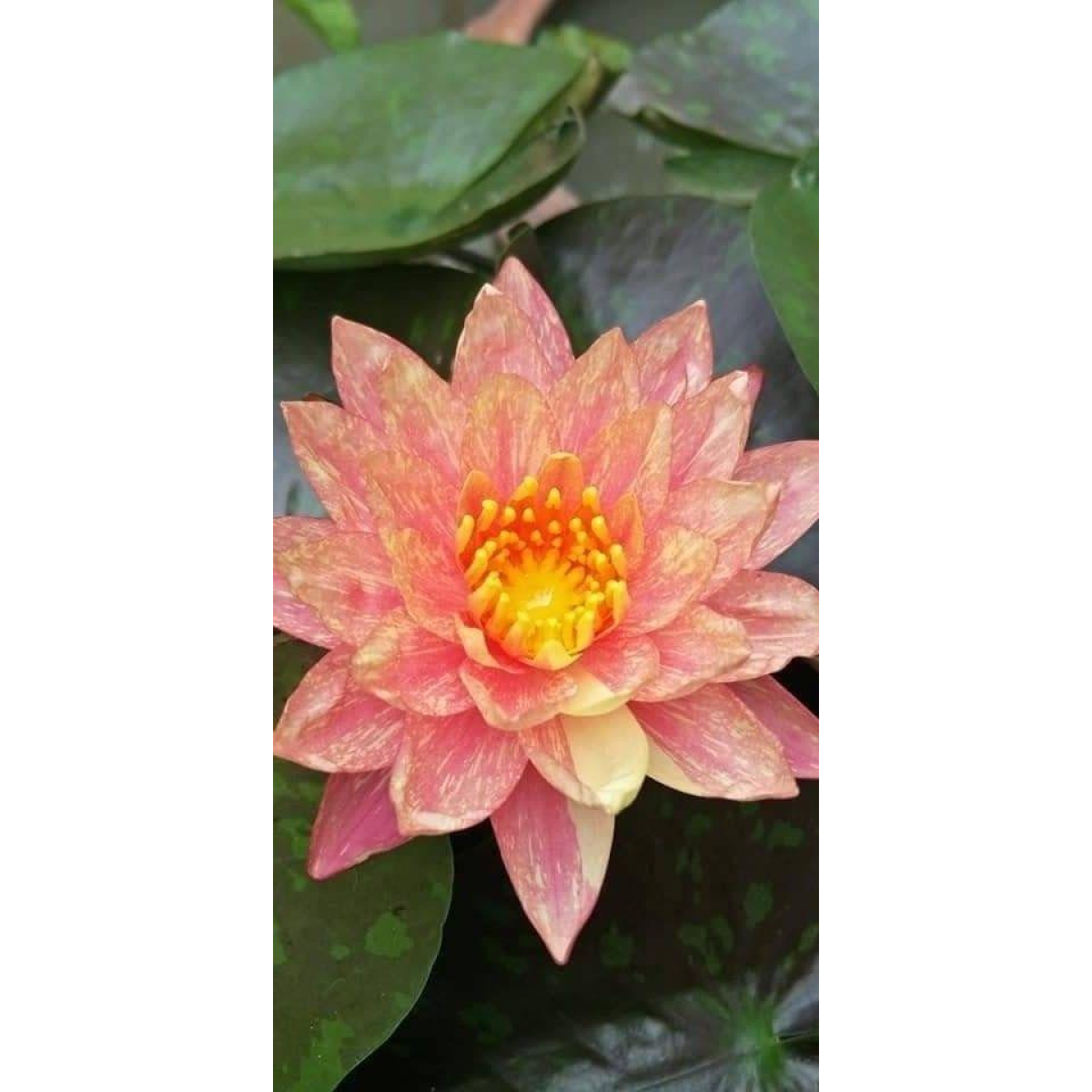 НІМФЕЯ ВАНВІЗА - один з найкрасивіших і великих сортів. Квітка дуже велика, червоно-жовта, зірчаста з подовженими пелюстками, яскраво-жовті тичинки. Кожна квітка має свій окрас - від рябих до плямистих. Квітка стирчить над водою. Молоде листя зелене з бурими розводами і каштановим крапом дуже велике. Рясно цвіте усе літо. Дуже великий сорт - для середніх або великих ставків. Зимує в непромерзаючій водоймі.