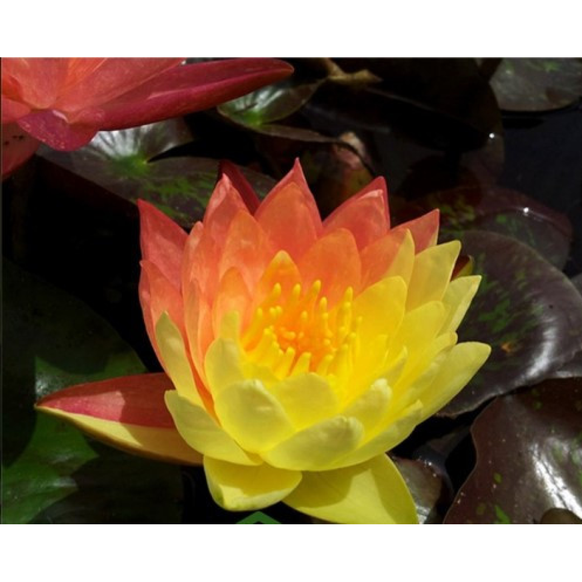 НІМФЕЯ ВАНВІЗА - один з найкрасивіших і великих сортів. Квітка дуже велика, червоно-жовта, зірчаста з подовженими пелюстками, яскраво-жовті тичинки. Кожна квітка має свій окрас - від рябих до плямистих. Квітка стирчить над водою. Молоде листя зелене з бурими розводами і каштановим крапом дуже велике. Рясно цвіте усе літо. Дуже великий сорт - для середніх або великих ставків. Зимує в непромерзаючій водоймі.