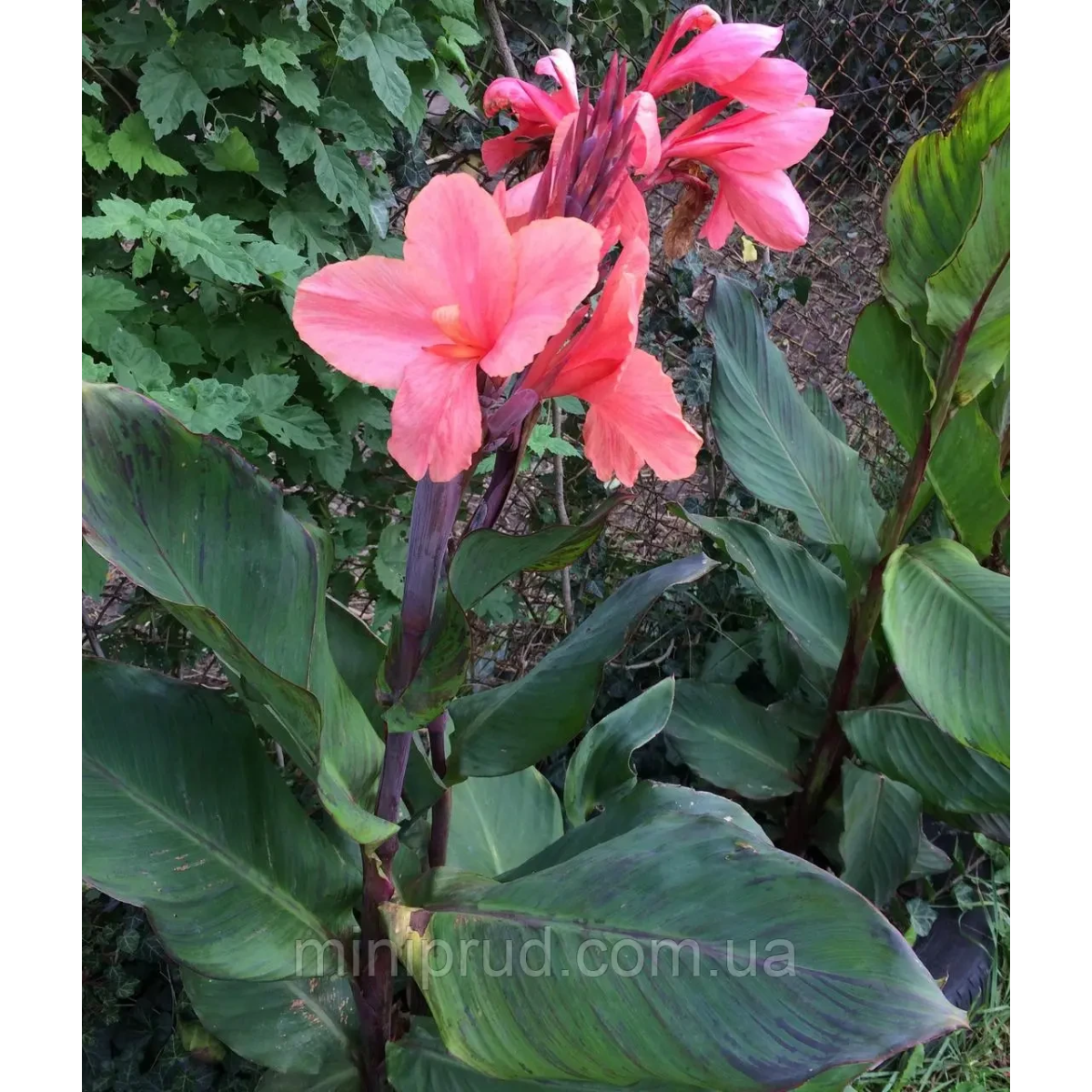 КАННА ВОДНА із строкатим листям та рожевою квіткою - один з найкрасивіших сортів водних канн. Ця позиція - канни з яскраво-рожевими або малиновими квітами. Випускає довгі вигнуті квітконоси з великою кількістю квіток, схожих на орхідею, на одній кисті одночасно може цвісти кілька квіток, кожна з яких тримається до 1 тижня. Радує квітами не тільки розкішним цвітінням, але і листом незвичайного забарвлення - на темно-зеленому листі хаотичні штрихи і смужки бурого кольору. Цвіте з червня і до заморозків. Невимоглива до розміщення - може рости як на сонці, так і в тіні (у тіні менше цвіте). Виростає до 0,7-1 м у висоту. Через велику парусність листя горщик з канной вимагає закріплення на дні водойми, щоб не перекидатися при сильному вітрі (можна обкласти горщик цеглою, придавити камінням тощо). Не сильно розростається - потребує пересадки у велику ємність на 3-4 рік.