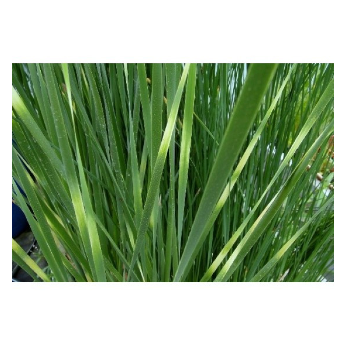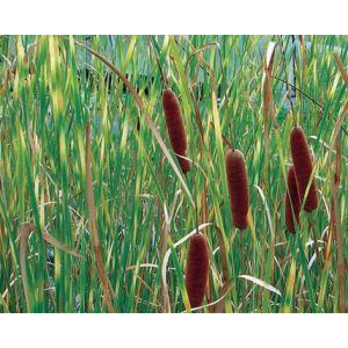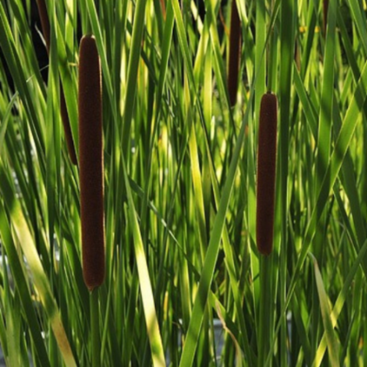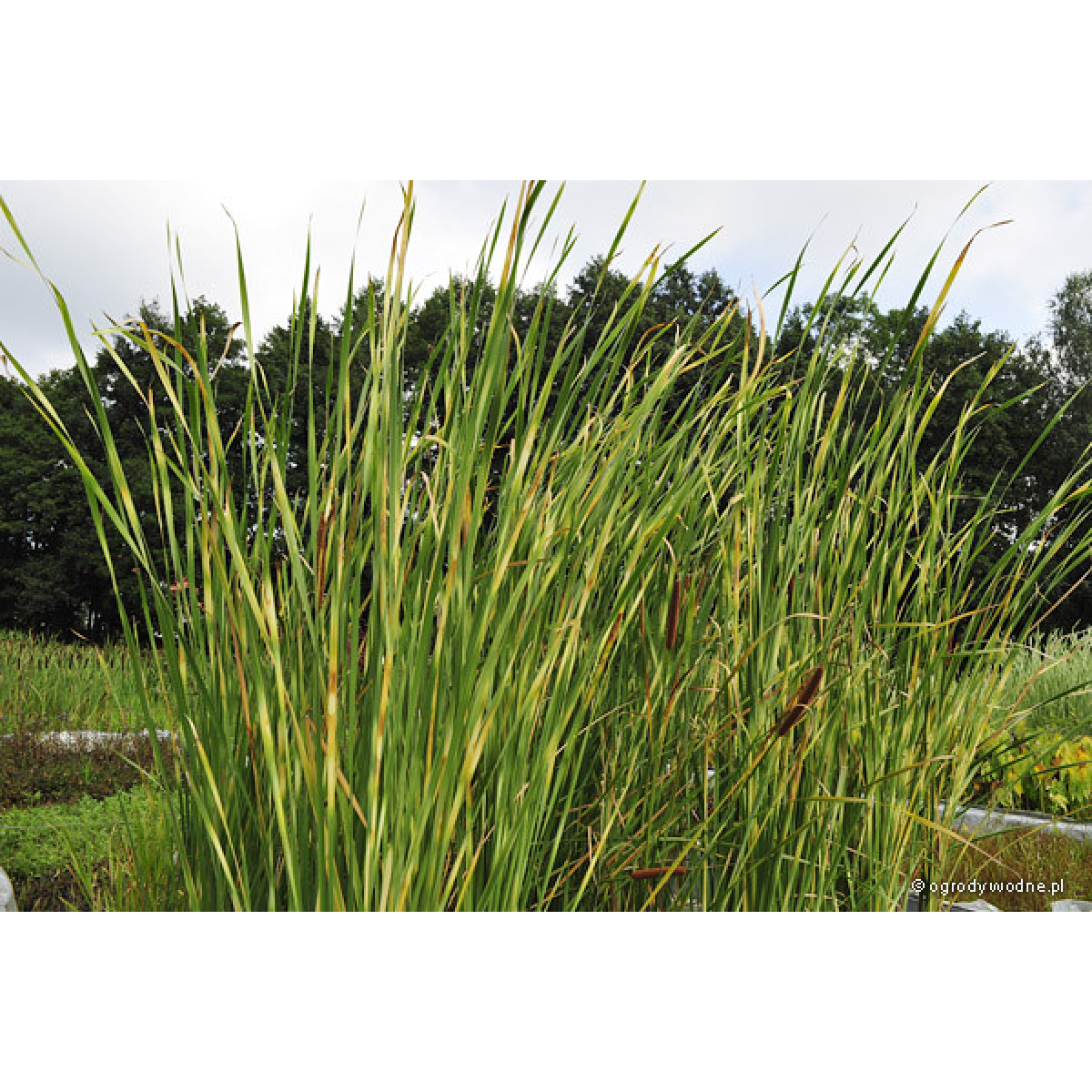 РОГІЗ ЗЕБРІНА - варієгатна, більш декоративна форма рогозу вузьколистого з поперечною жовтою полосою на листях. Це багаторічна водна і болотяна трав'яниста рослина, зазвичай виростає до 1,5 м заввишки. Росте на мілководді, мілинах і по берегах водойм на глибині до 60 см. Невибагливий, швидко розростається.