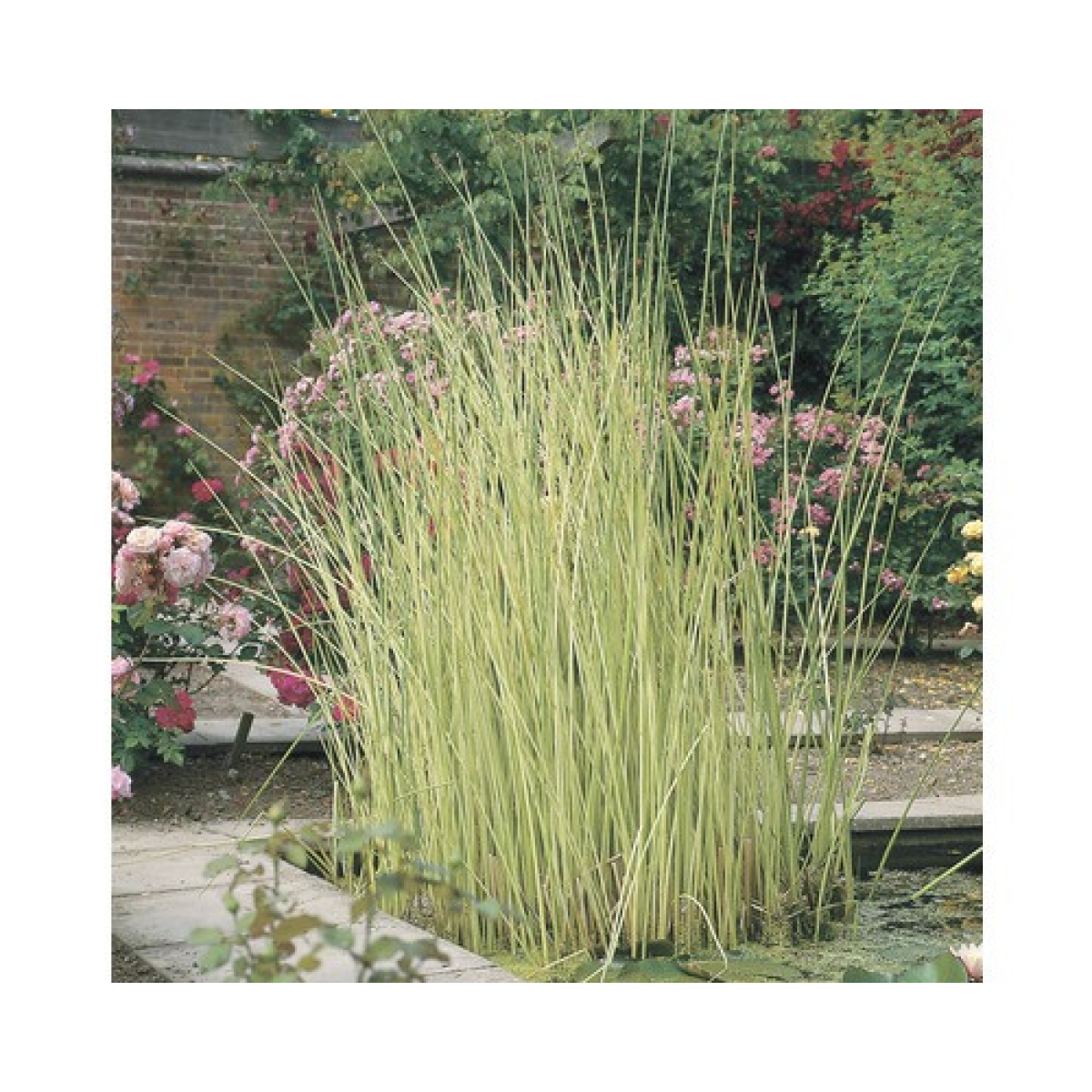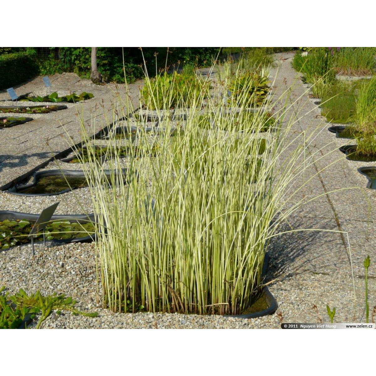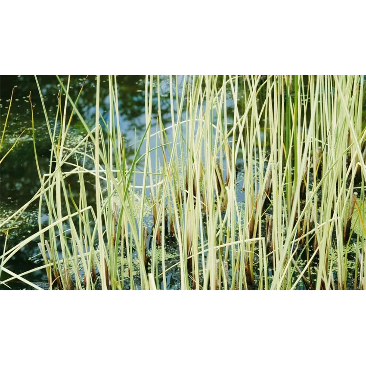 ОЧЕРЕТ АЛЬБА - варієгатний очерет, стебла білі чи жовтуваті. В залежності від освітлення, змінює яскравість забарвлення стебла, у тіні буде більш жовтим. Стебла 5-7 мм завтовшки, заввишки 0,5-1,2 м. Витримує занурення до 30 см. Стебла порожнисті, ламкі, при сильному вітрі можуть зламатися. При обрізці дає багато нових пагонів.