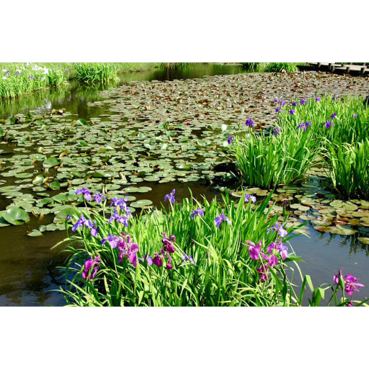 ІРИС ВОДЯНИЙ ЯПОНСЬКИЙ (фіолетовий) - мілководна рослина. Можна висадити безпосередньо в грунт біля берегу (в зоні затоплення або рясного поливу) або у воді (на глибині до 10-15 см) в сітчастому горщику або безпосередньо в ставок. У нашій кліматичній зоні чудово зимує прямо у водоймі. Рекомендується для посадки на біоплато, досягає у висоту 60-100 см, має стрілоподібні вузькі листя і цвіте синіми квітками. Цвіте японський ірис в травні-червні. Ірис любить рости на сонячних, добре освітлених місцях, проте переносить затінення також дуже добре.