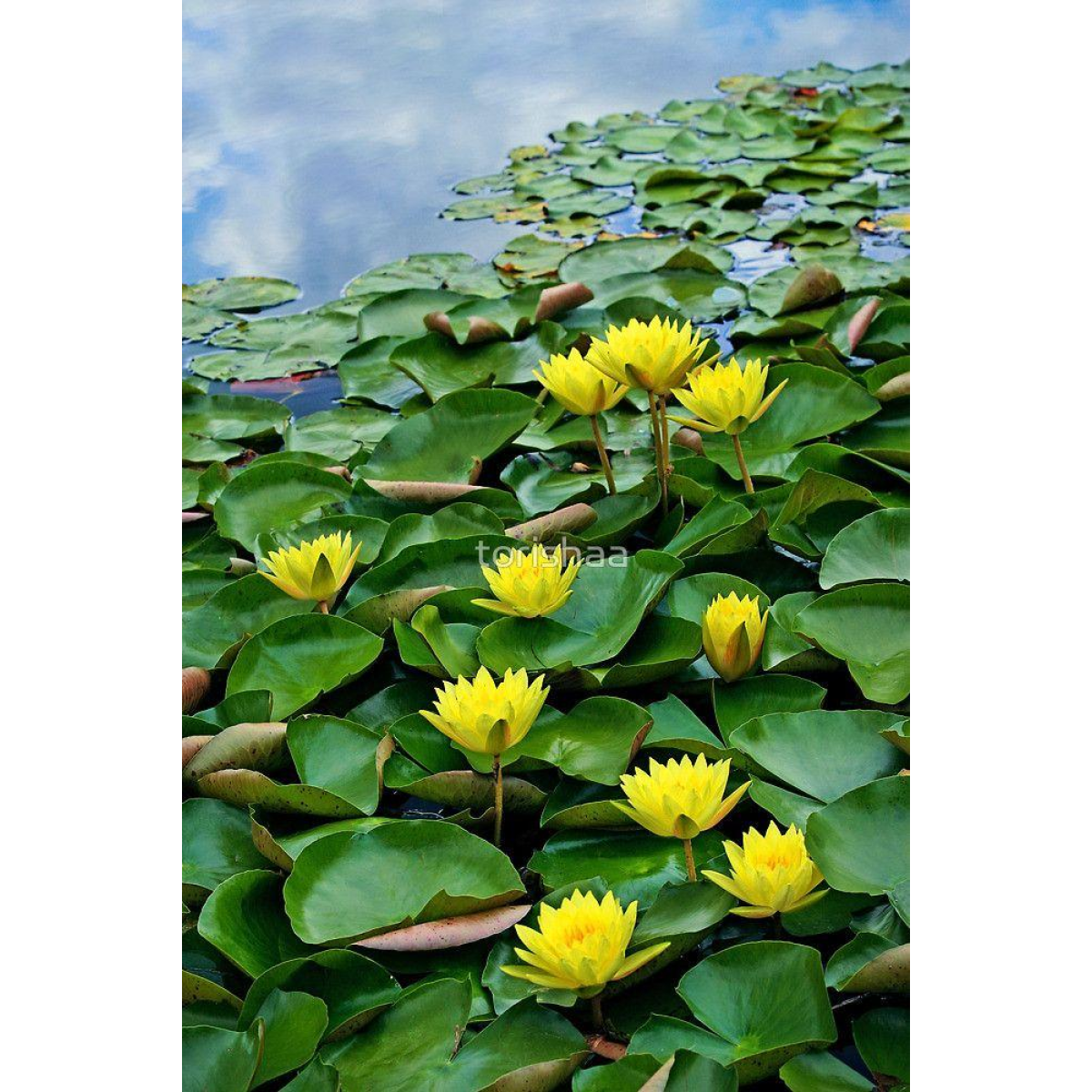 НІМФЕЯ ДЖОЙ ТОМАСИК - великий сорт німфеї з яскравими жовтими квітами. Квітка яскраво-жовта, на ніжці, стоїть над водою, листя великі, зелені в бордову крапочку. Невибаглива, легко переносить пересадку. Зимує в непромерзаючому водоймі. Підійде для початківців прудоводов. Для великих, середніх ставків.