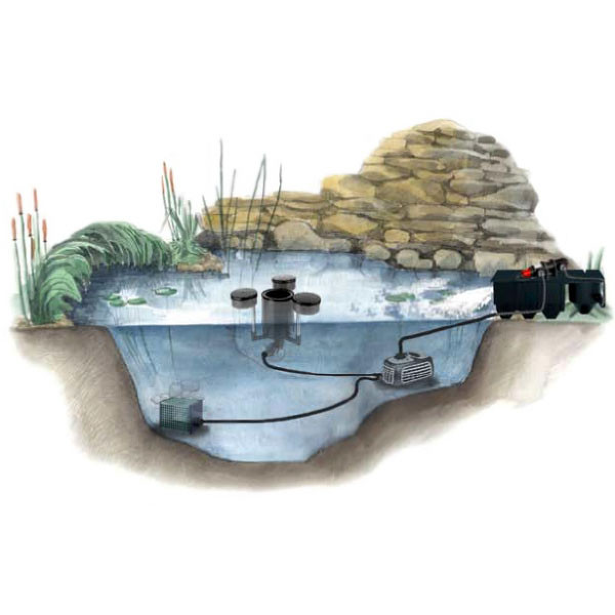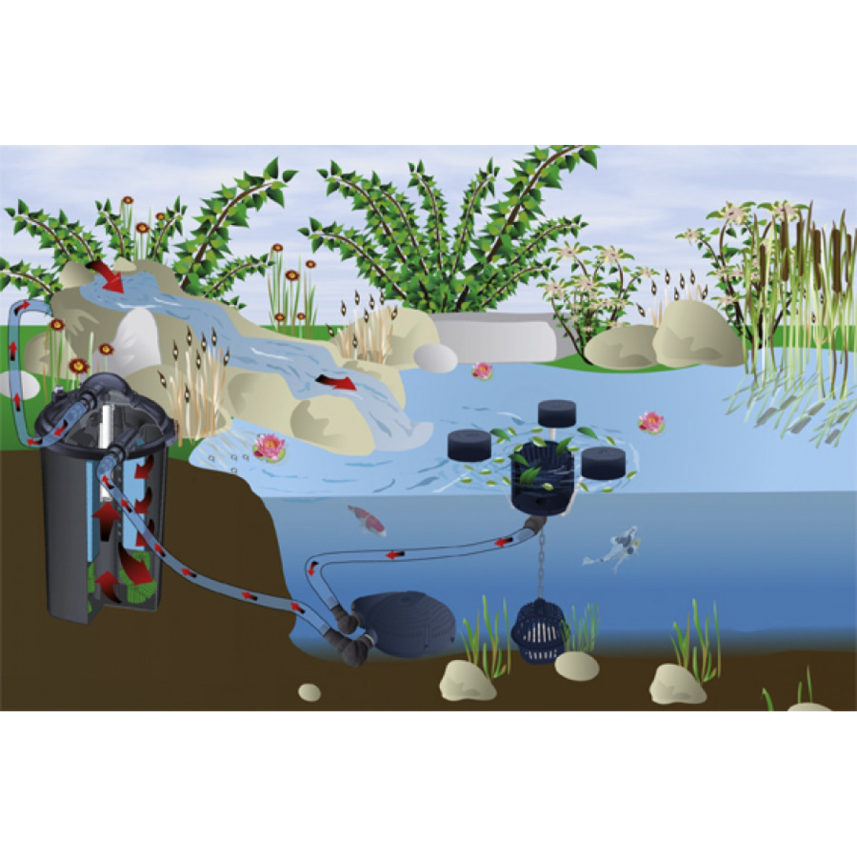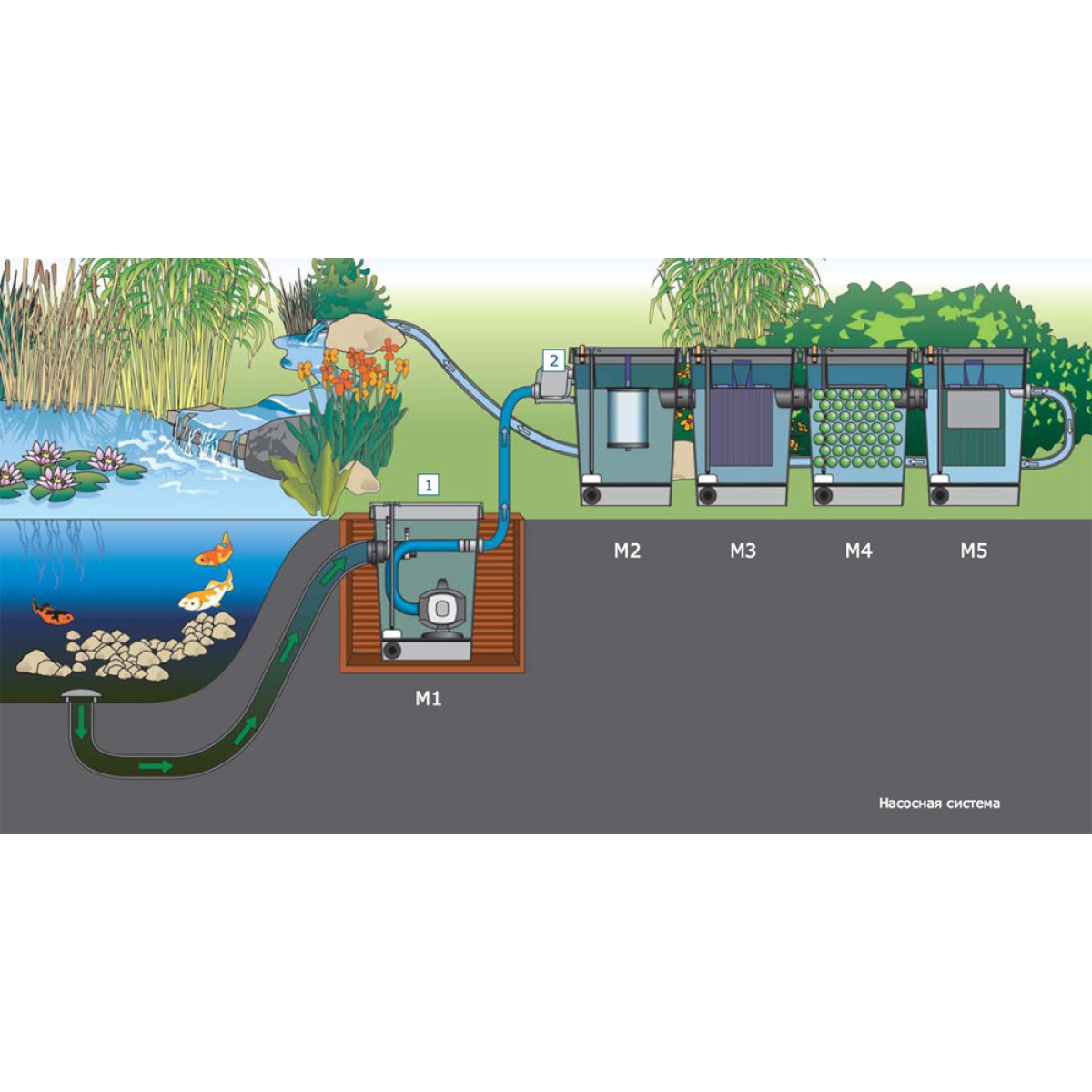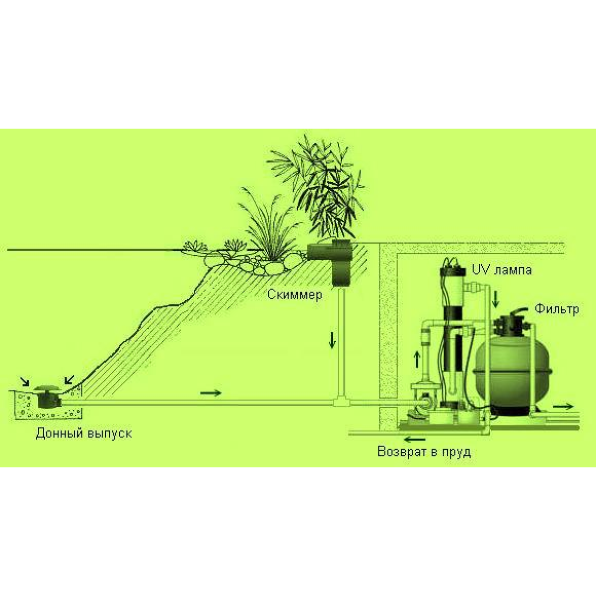 1. Механічна очистка. За допомогою механічного очищення з води видаляється різне сміття і водорості. Найчастіше, в якості очисних пристроїв застосовуються спеціальні пристрої - фільтри. Пристрій фільтрів для ставка з механічною очисткою входить контейнер, який наповнений пористим матеріалом, таким як кварцовий пісок або гравій. Вода, проходячи через нього, залишає різне сміття, фракція якого безпосередньо залежить від фракції фільтруючого матеріалу. Подається вода у фільтр за допомогою насосу.